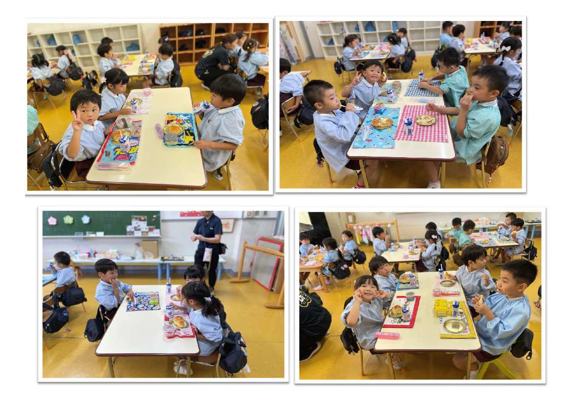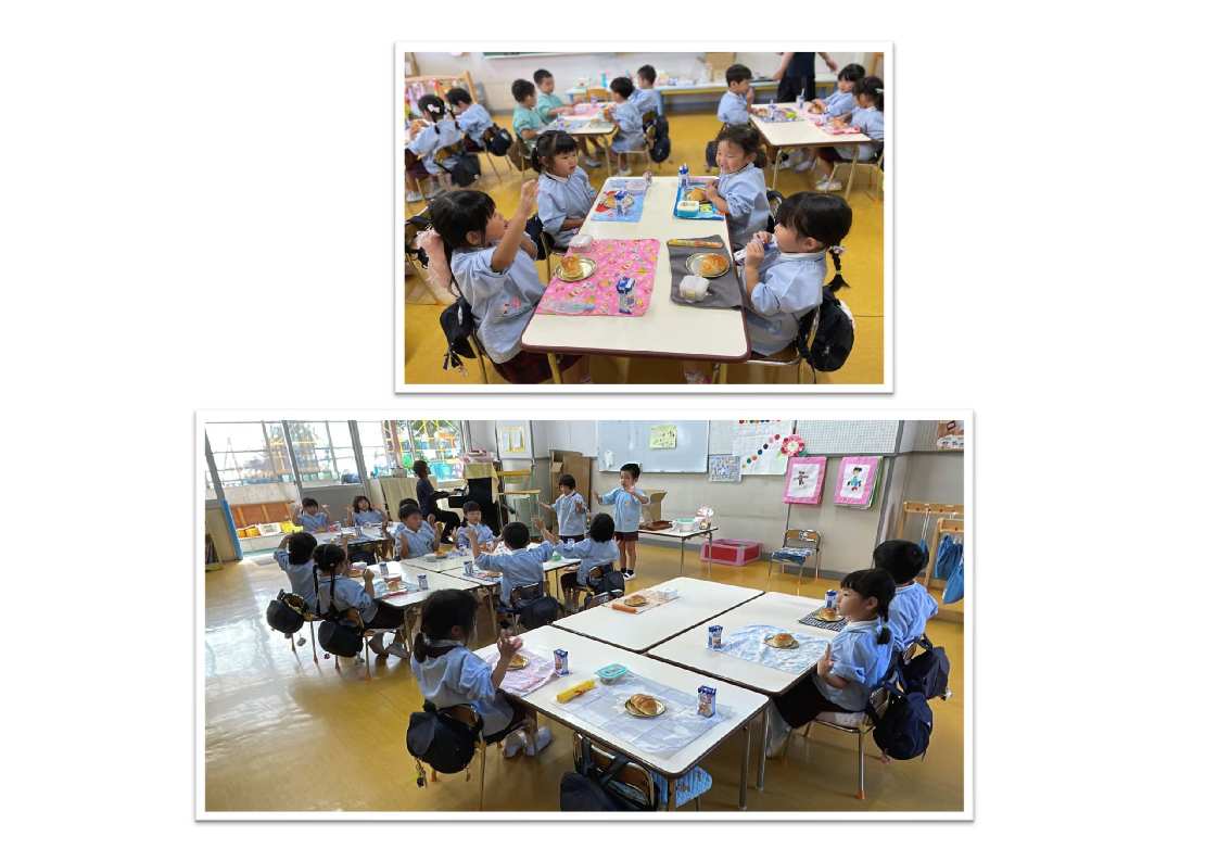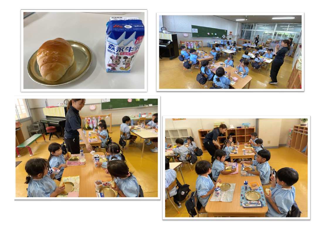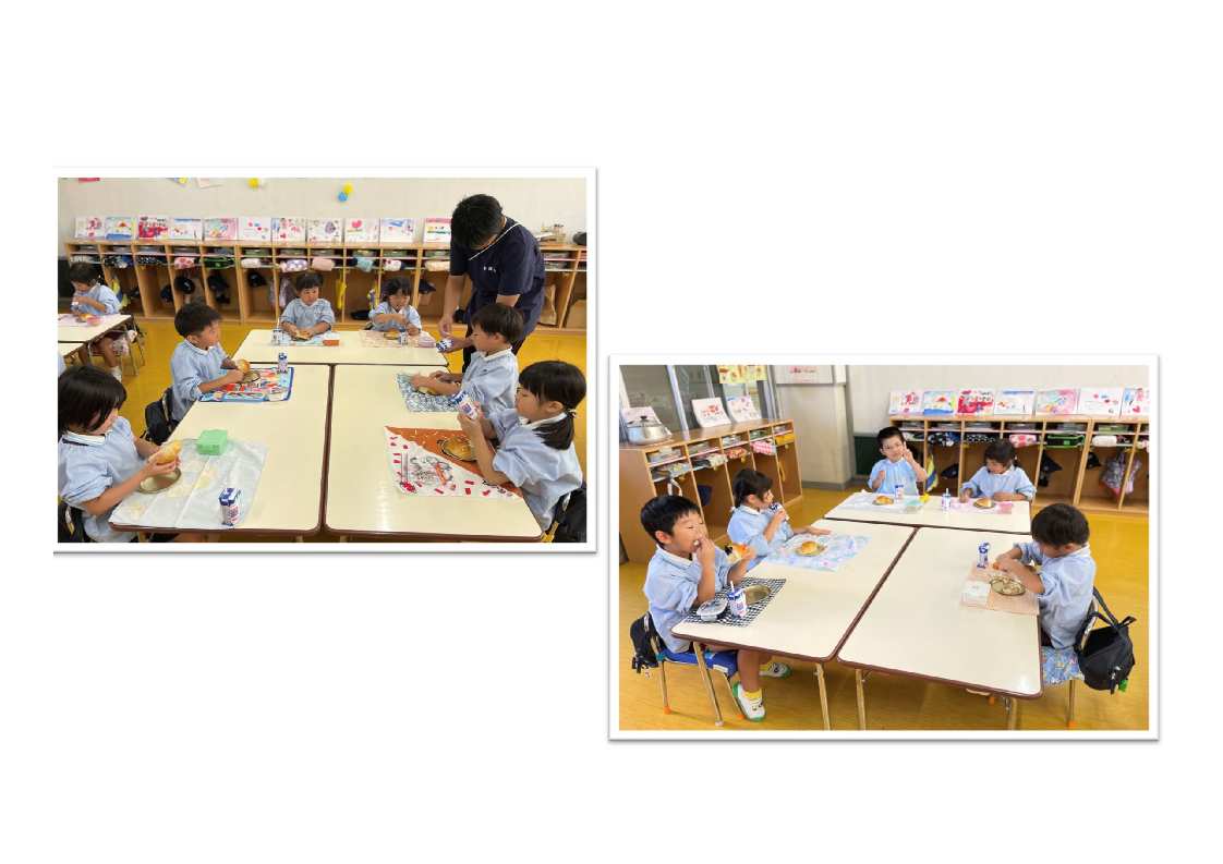 3才児はパン1個を食べられるように、4・5才児は食べられる量に合わせて(持参した)おかずをパンといっしょに食べます。