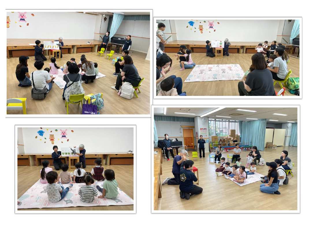 あたたかい雰囲気の中で、歌をうたったり、手遊びをしたり、大きな絵本を先生に読んでもらったりして、楽しい時間を過ごします。