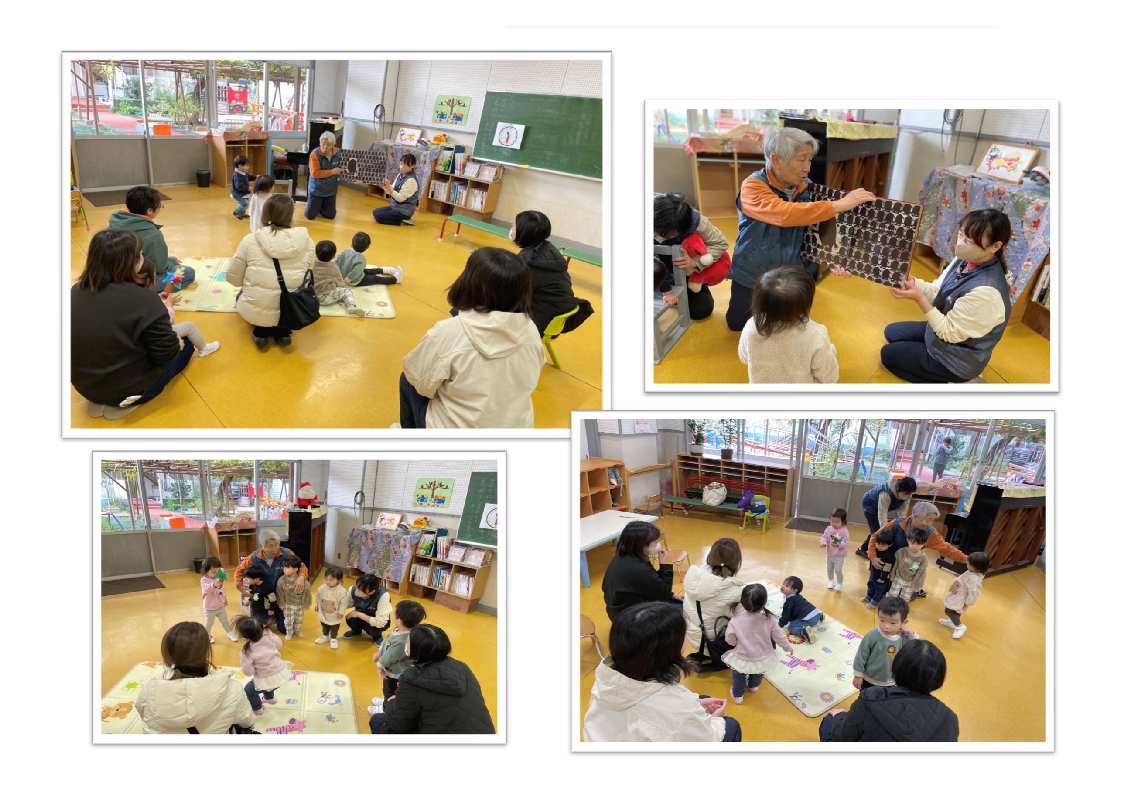 あたたかい雰囲気の中で、歌をうたったり、手遊びをしたり、大きな絵本を先生に読んでもらったりして、楽しい時間を過ごします。