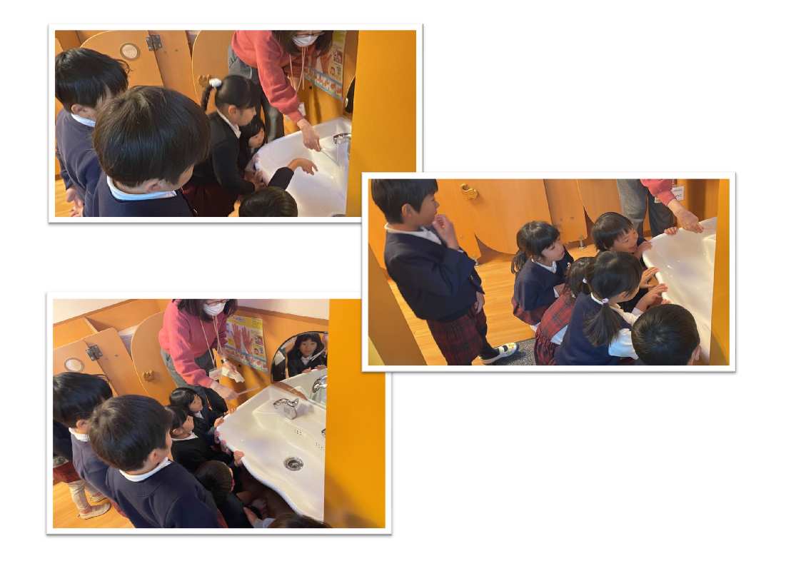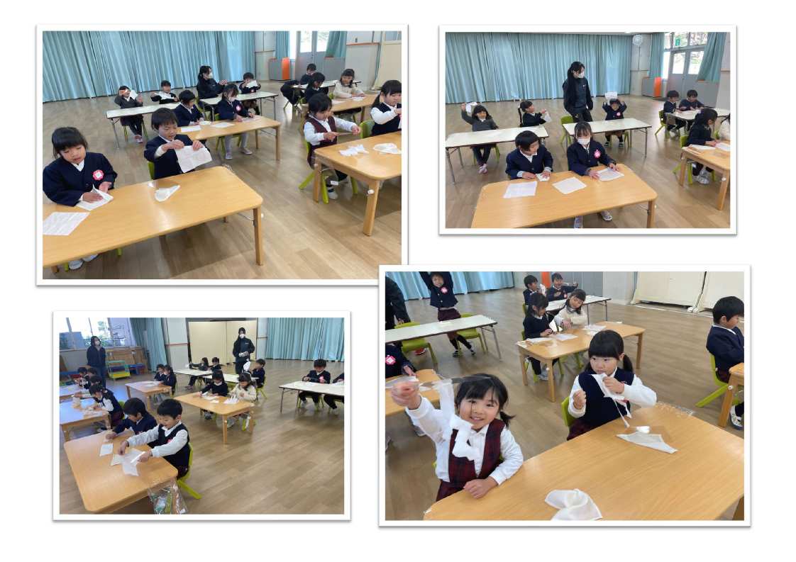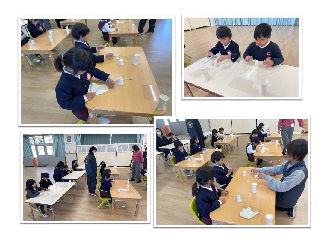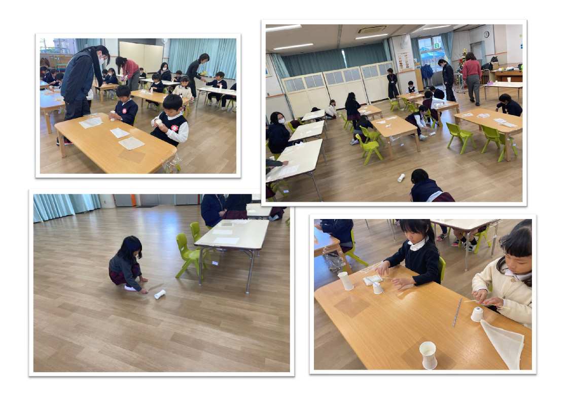 ティッシュペーパー や 紙コップ車輪、ストロー を動かしたり、髪の毛を立たたせたり、蛇口の水を動かしたりしてあそびました。