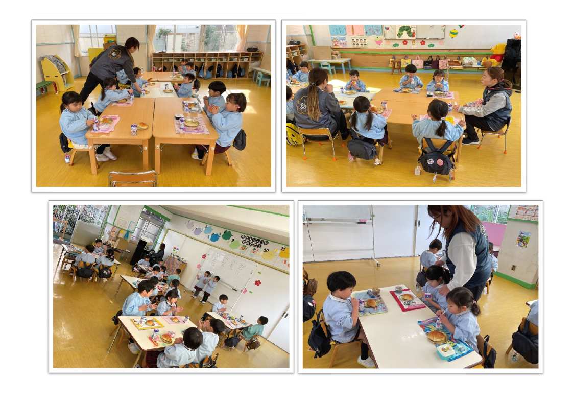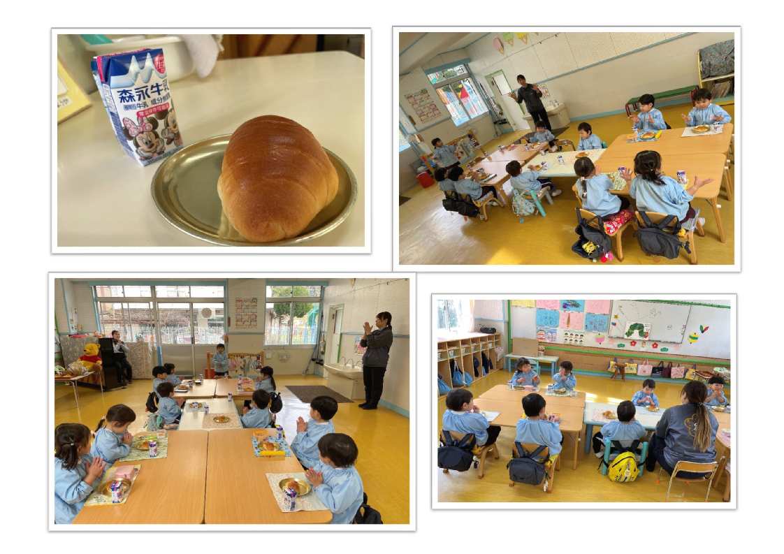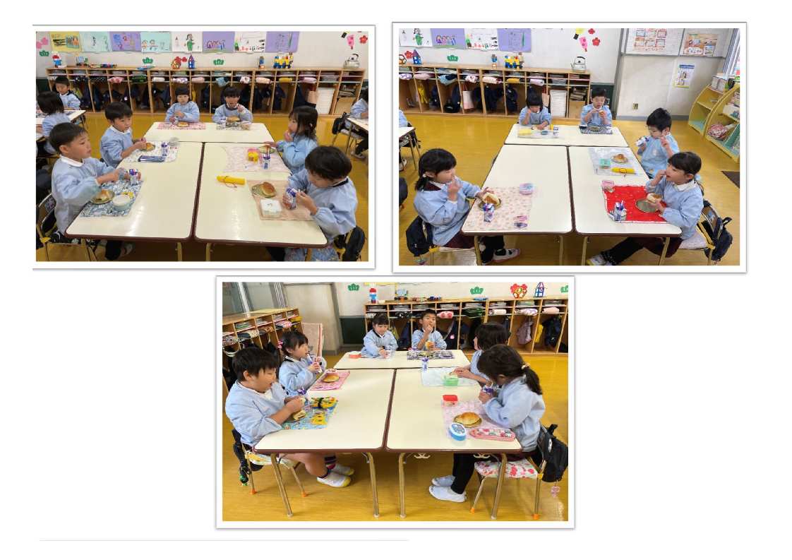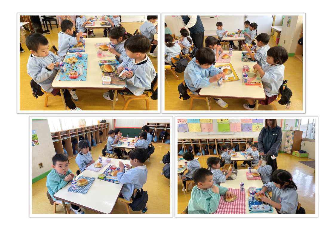3才児はパン1個を食べられるように、4・5才児は食べられる量に合わせて(持参した)おかずをパンといっしょに食べます。