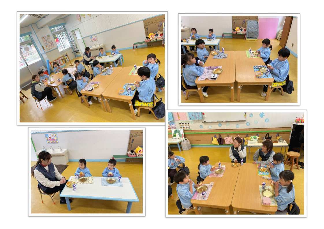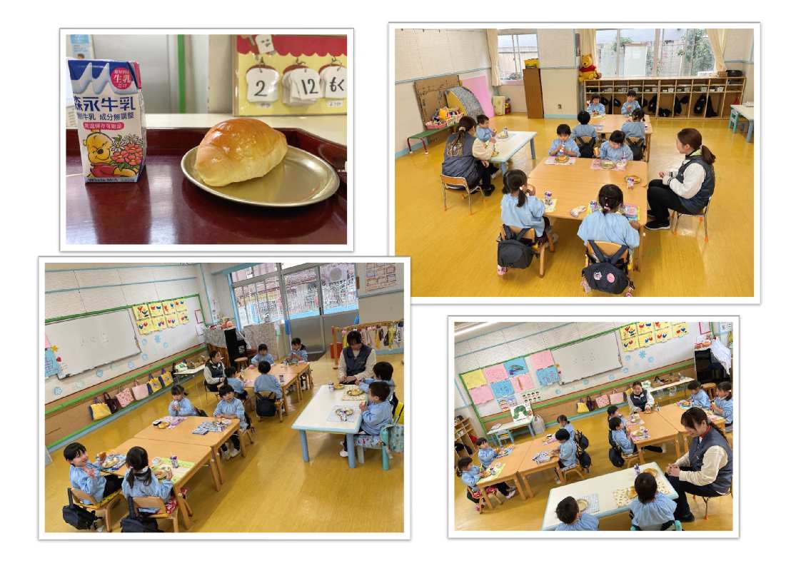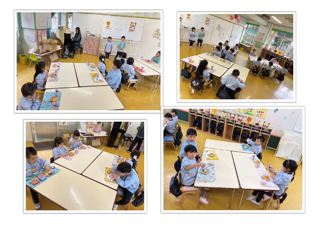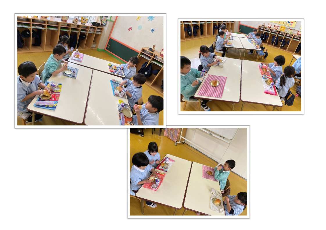 3才児はパン1個を食べられるように、4・5才児は食べられる量に合わせて(持参した)おかずをパンといっしょに食べます。