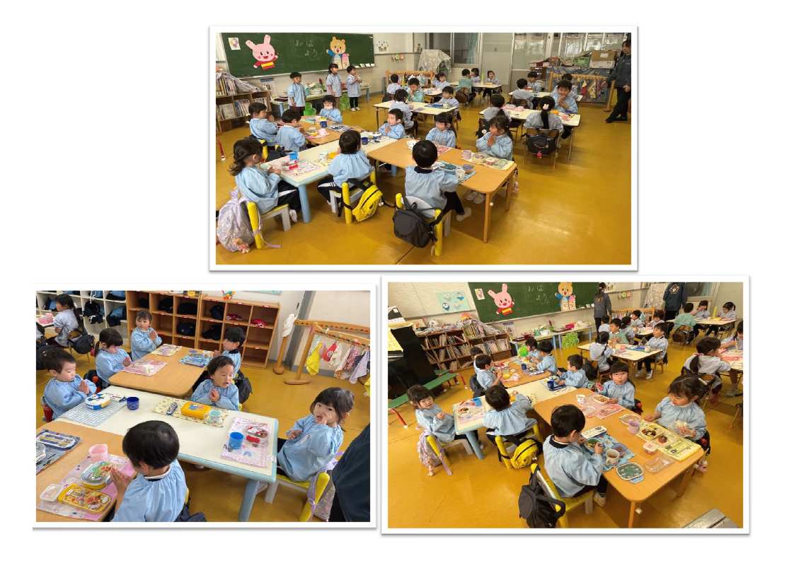 満三歳児は年少組さんと一緒にお昼ご飯を食べます。