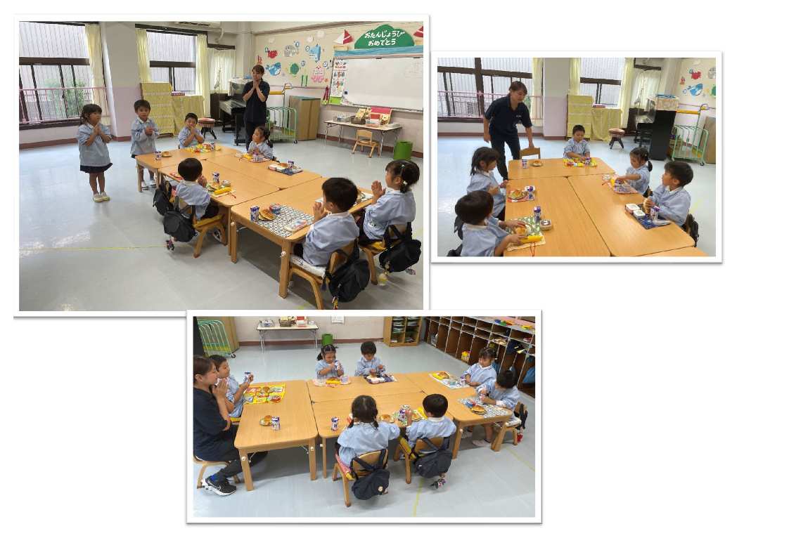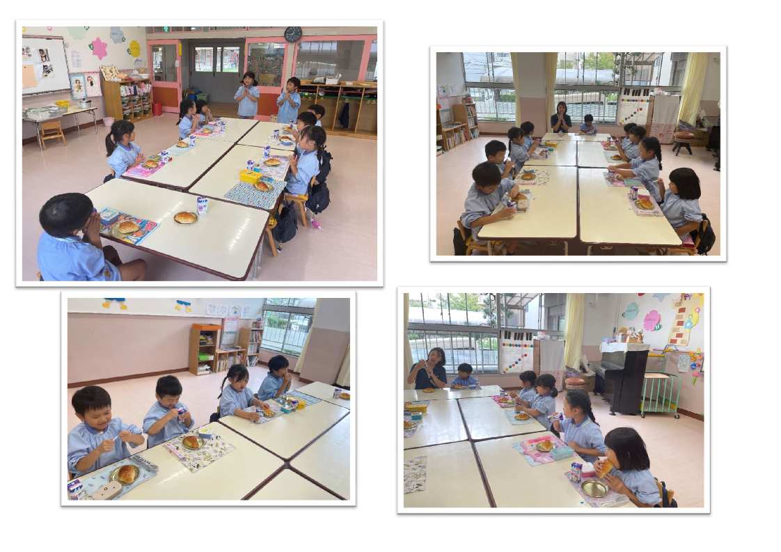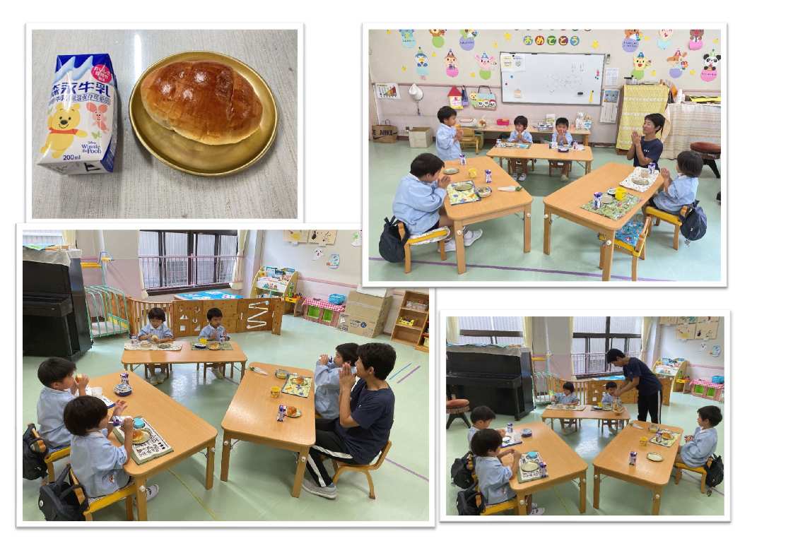 3才児はパン1個を食べられるように、4・5才児は食べられる量に合わせて(持参した)おかずをパンといっしょに食べます。