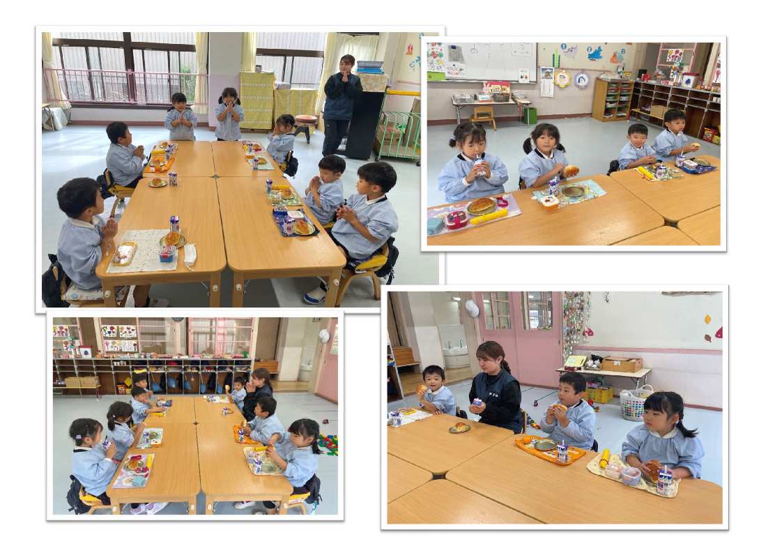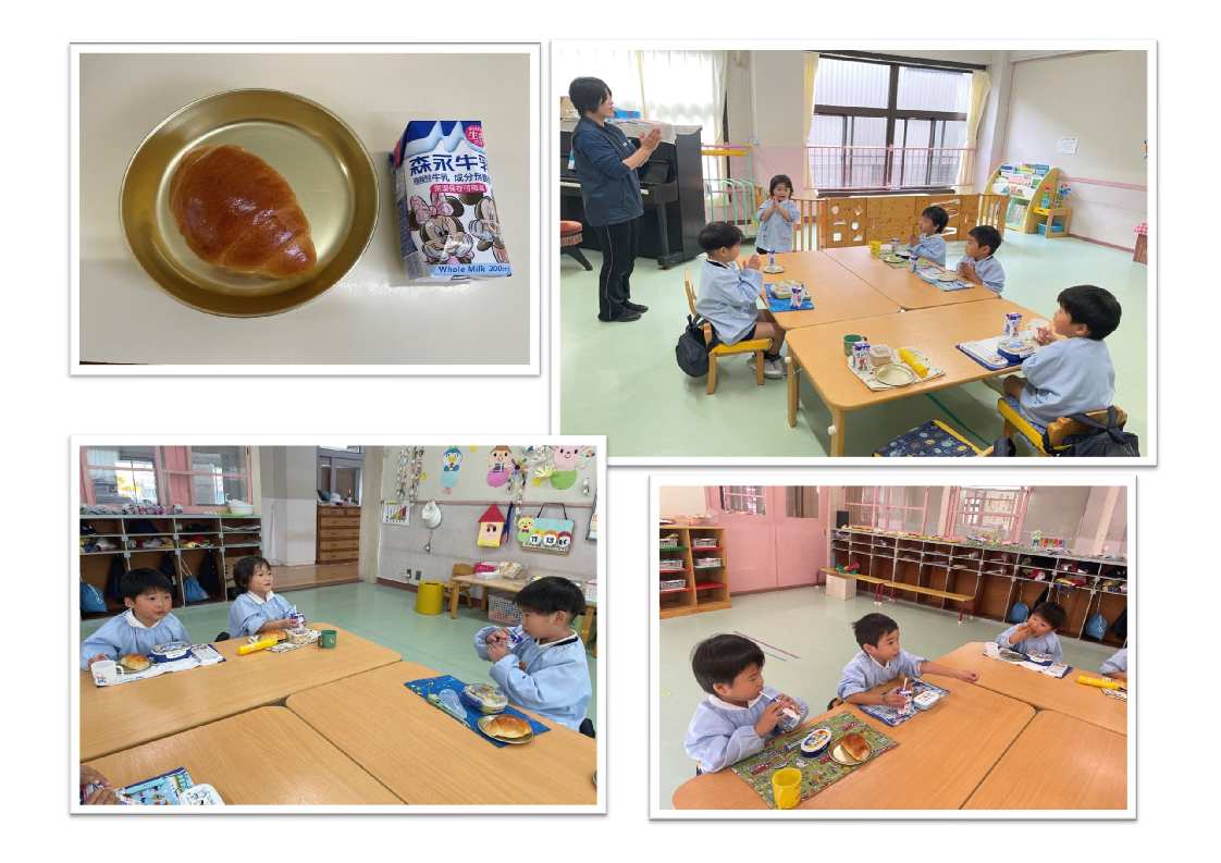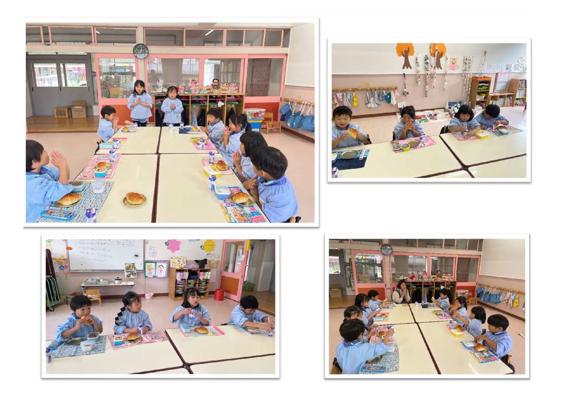 3才児はパン1個を食べられるように、4・5才児は食べられる量に合わせて(持参した)おかずをパンといっしょに食べます。