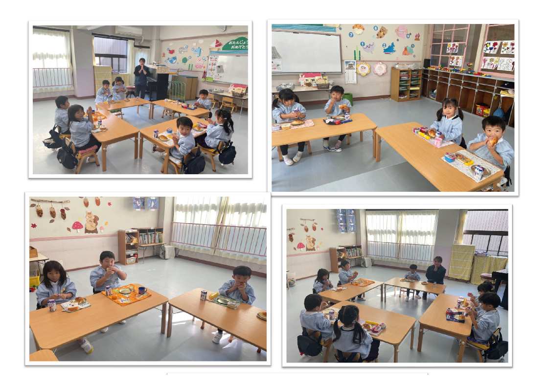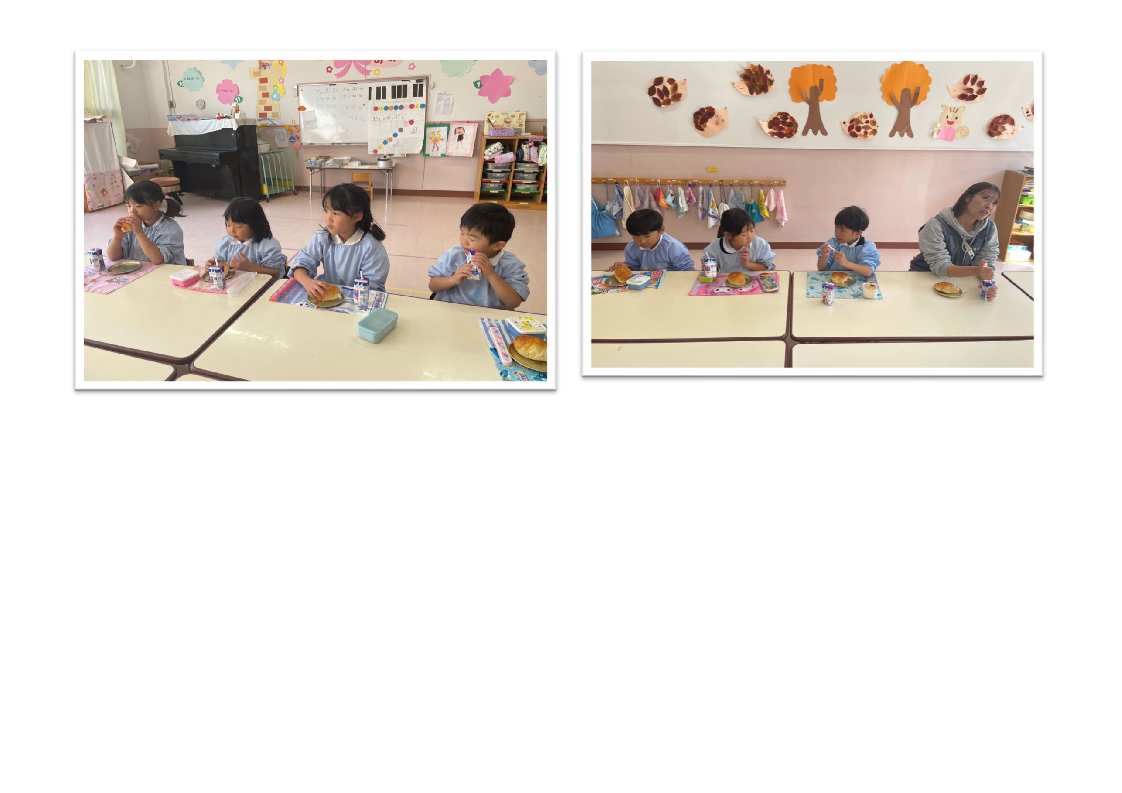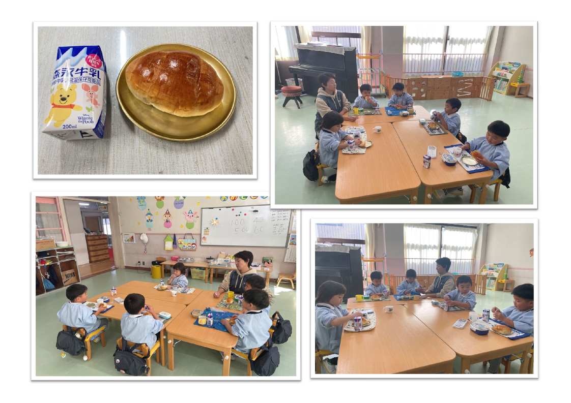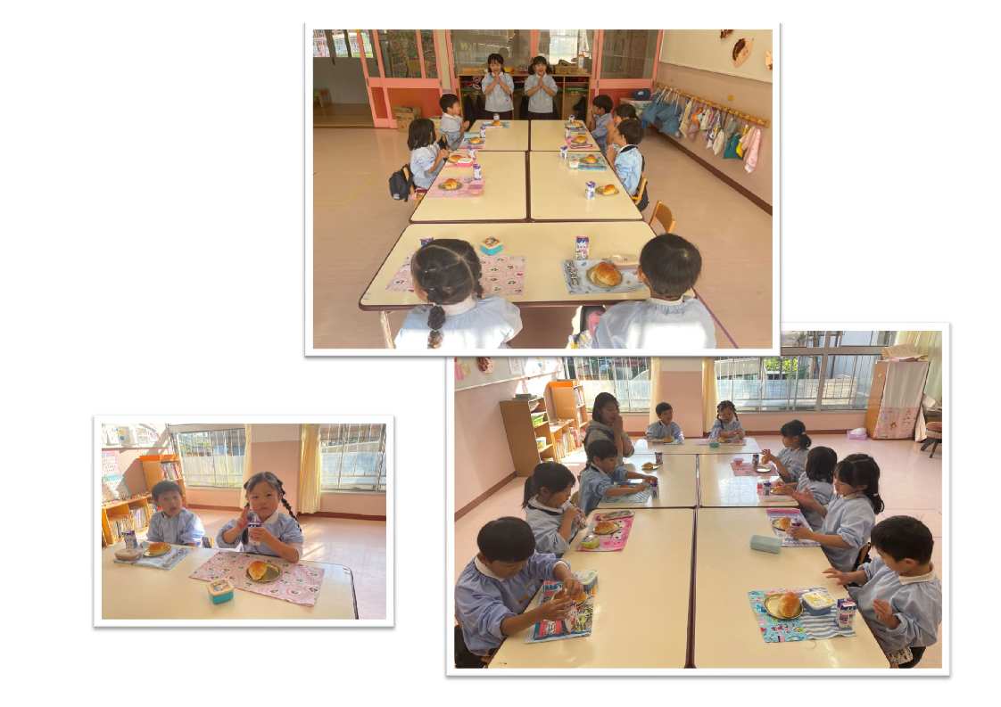 3才児はパン1個を食べられるように、4・5才児は食べられる量に合わせて(持参した)おかずをパンといっしょに食べます。