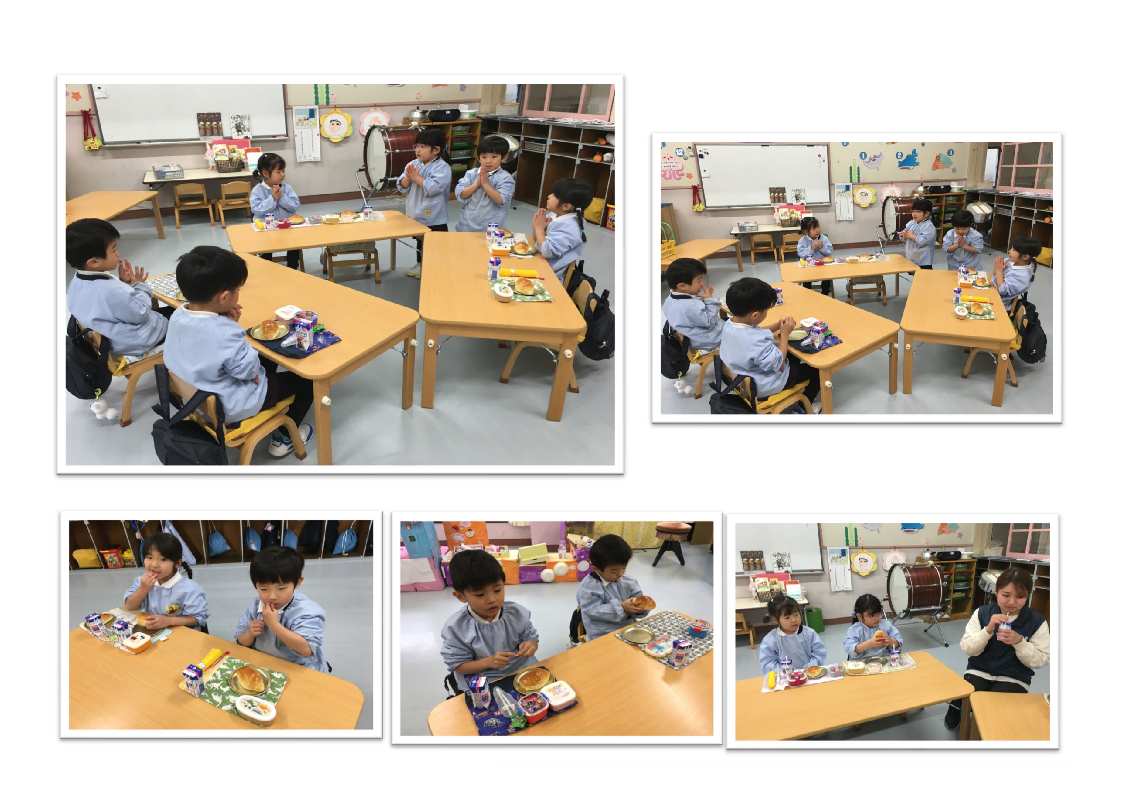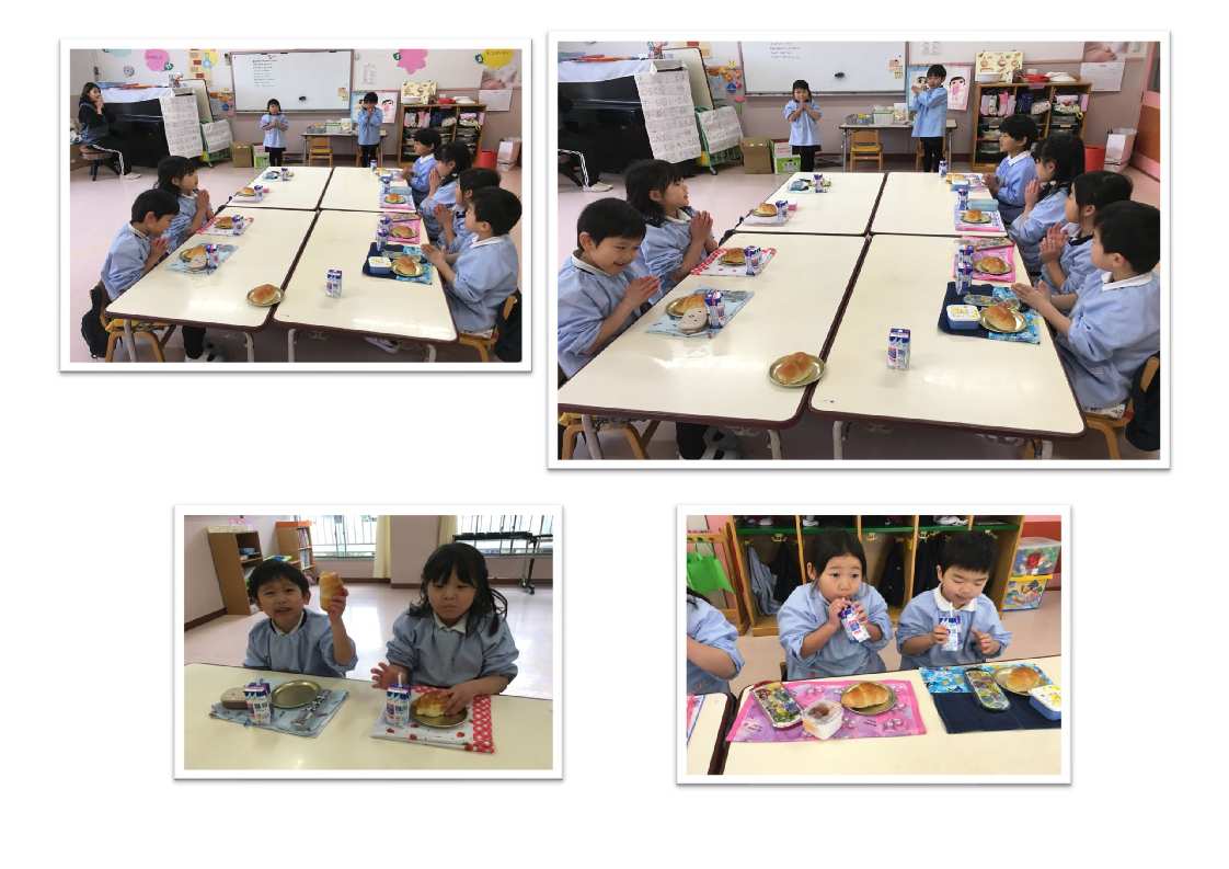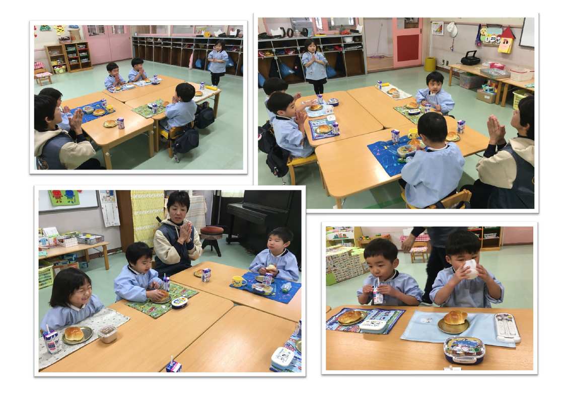 3才児はパン1個を食べられるように、4・5才児は食べられる量に合わせて(持参した)おかずをパンといっしょに食べます。