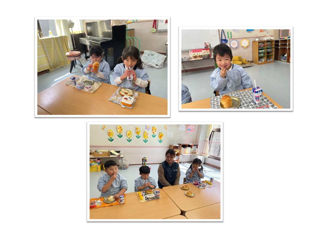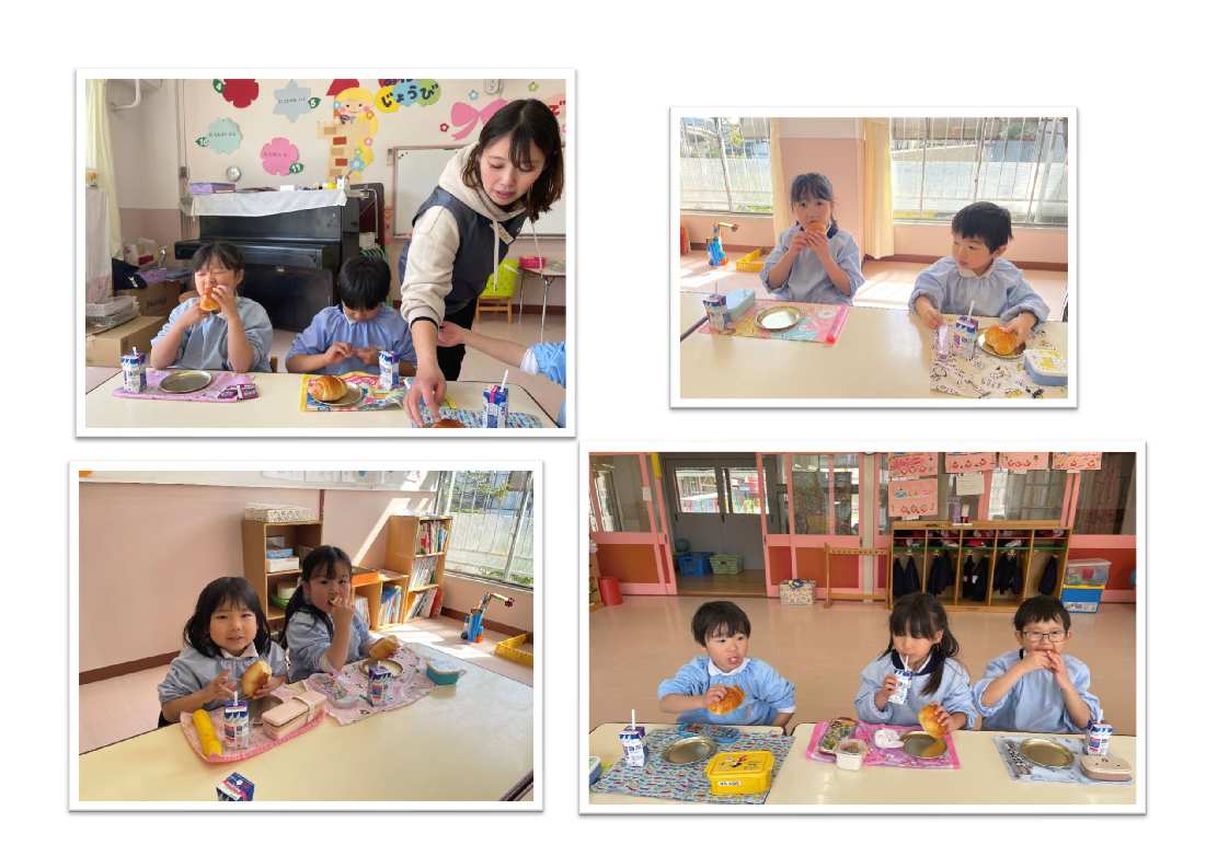 3才児はパン1個を食べられるように、4・5才児は食べられる量に合わせて(持参した)おかずをパンといっしょに食べます。